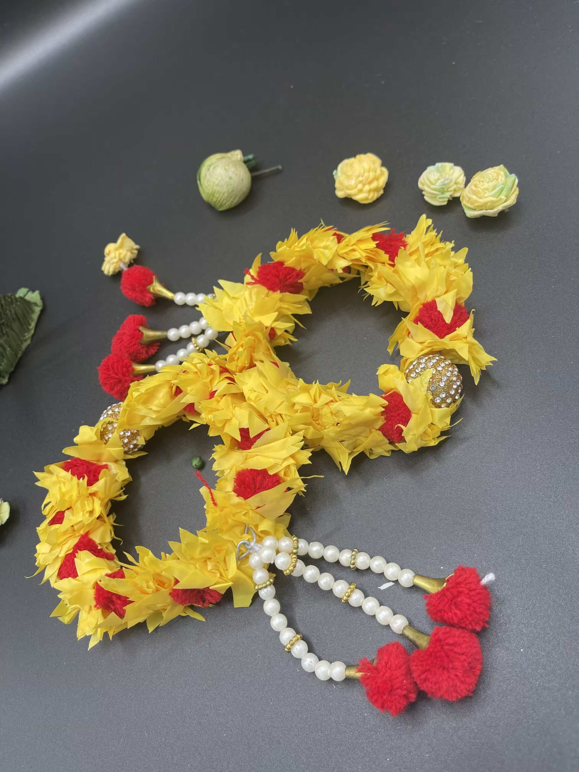 Bring elegance and tradition to your special moments with this Handcrafted Artificial Flower Garland (Mala) — beautifully designed with a blend of soft yellow or white petals, red pom-poms, golden accents, and pearl bead tassels. Each piece is carefully made to resemble real floral garlands while providing the lasting beauty and convenience of artificial materials.