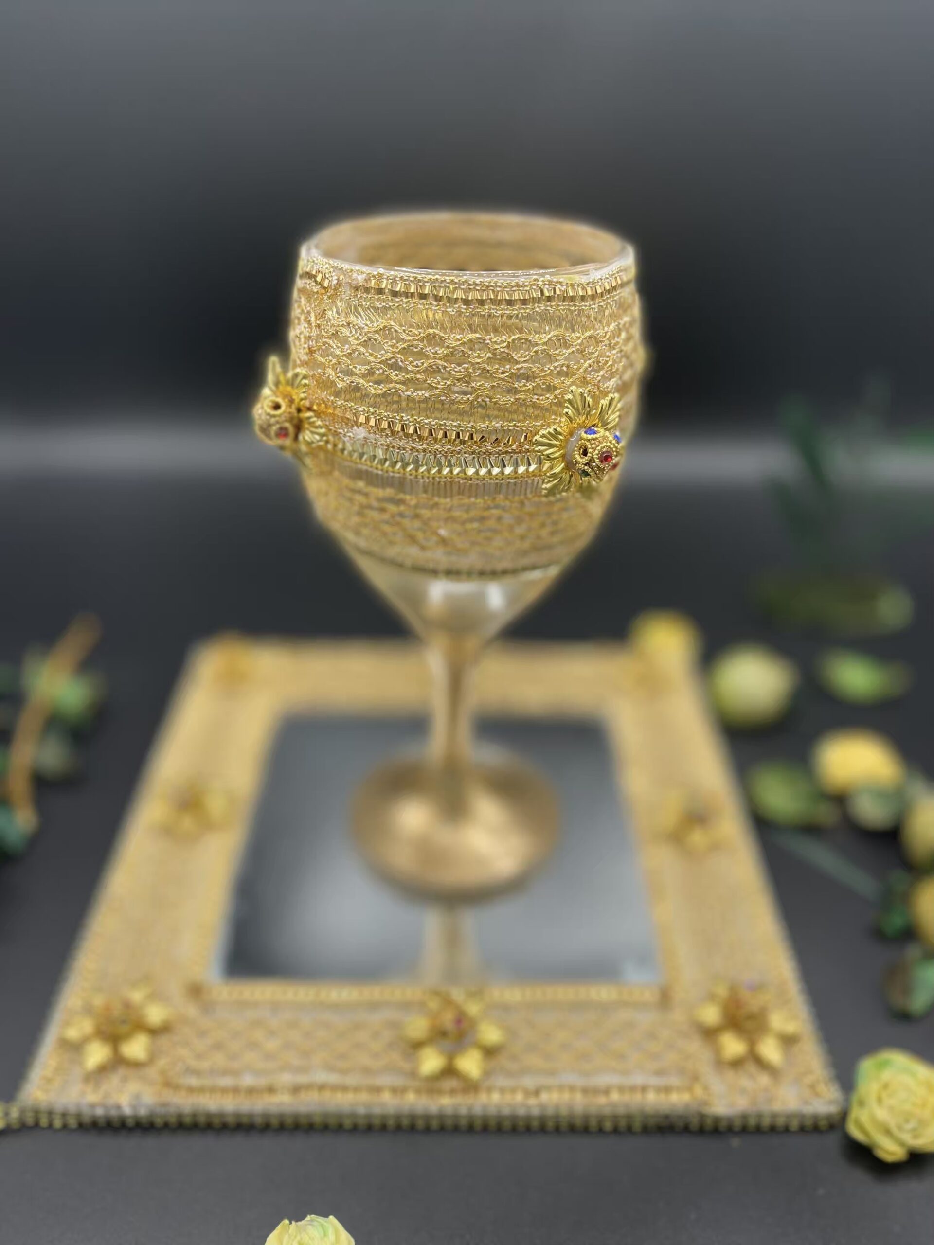 The glass is beautifully adorned with gold lace, floral accents, and subtle beadwork, exuding sophistication and grace. It rests upon a matching square mirror tray, bordered with golden embroidery and delicate embellishments that create a radiant, regal effect.